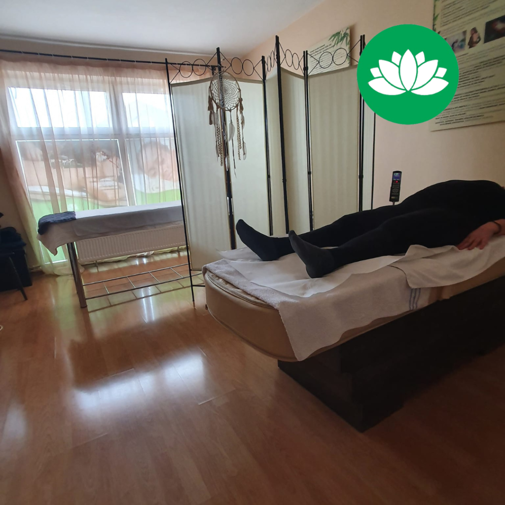 - Terapia pe patul cu role de jad și turmalină – ajută la relaxarea mușchilor contractați, la detensionarea zonei toracice și la realinierea coloanei prin mișcări blânde și presiune controlată.